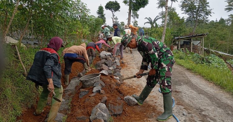 MAGELANG - Anggota Koramil Kaliangkrik beserta Babinsa Desa Mangli, Kecamatan Kaliangkrik Kabupaten Magelang melaksanakan kegiatan Karya bakti bangun talud di Dusun Mbojong Desa Mangli Kecamatan Kaliangkrik, Rabu (27/11).
