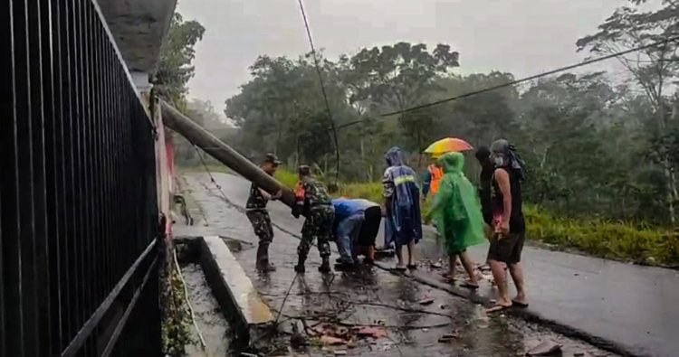 MAGELANG - Sejumlah personil Koramil 15/ Dukun Kodim 0705/ Magelang membantu petugas PLN mengamankan Pal listrik yang roboh tertimpa pohon yang tumbang disebabkan hujan disertai angin kencang pada sore hari yang terjadi di Dusun Krajan Desa Krinjing Kecamatan Dukun Kabupaten Magelang, Sabtu (25/10).