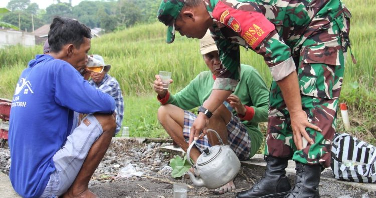 Sertu Fauzi salah satu personil yang terlibat pembangunan jembatan nampak kompak dan dekat dengan warga masyarakat disela - sela istirahat kerja, menyempatkan untuk menuangkan segelas air hangat kepada warga untuk menghilangkan rasa dahaga.
