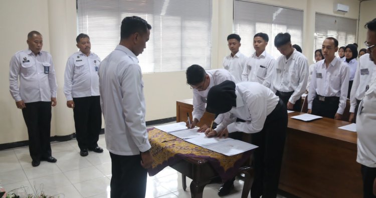 Prosesi penandatanganan perjanjian kerja dilakukan secara simbolis, disaksikan oleh pejabat struktural serta para pembimbing dari masing-masing seksi.