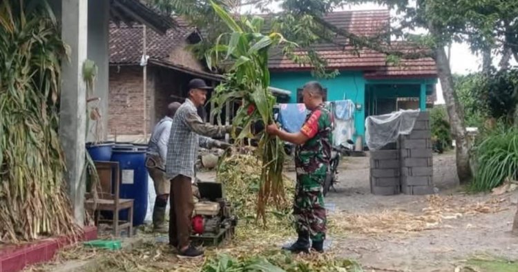 MAGELANG - Serda Rasito Babinsa Desa Tempursari membantu warga dalam membuat pengolahan pakan untuk hewan ternak berupa pohon jagung.