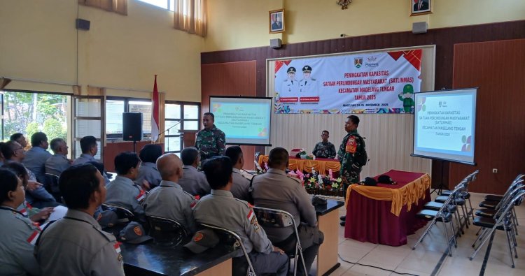 MAGELANG - Batuud Koramil 01 Magelang Tengah, Peltu Agus, memberikan pengarahan inspiratif kepada anggota Linmas Kecamatan Magelang Tengah dalam sebuah acara yang digelar hari ini di Lapangan Kwarasan, Kelurahan Magelang, Kecamatan Magelang Tengah, Kota Magelang, Senin (24/11)